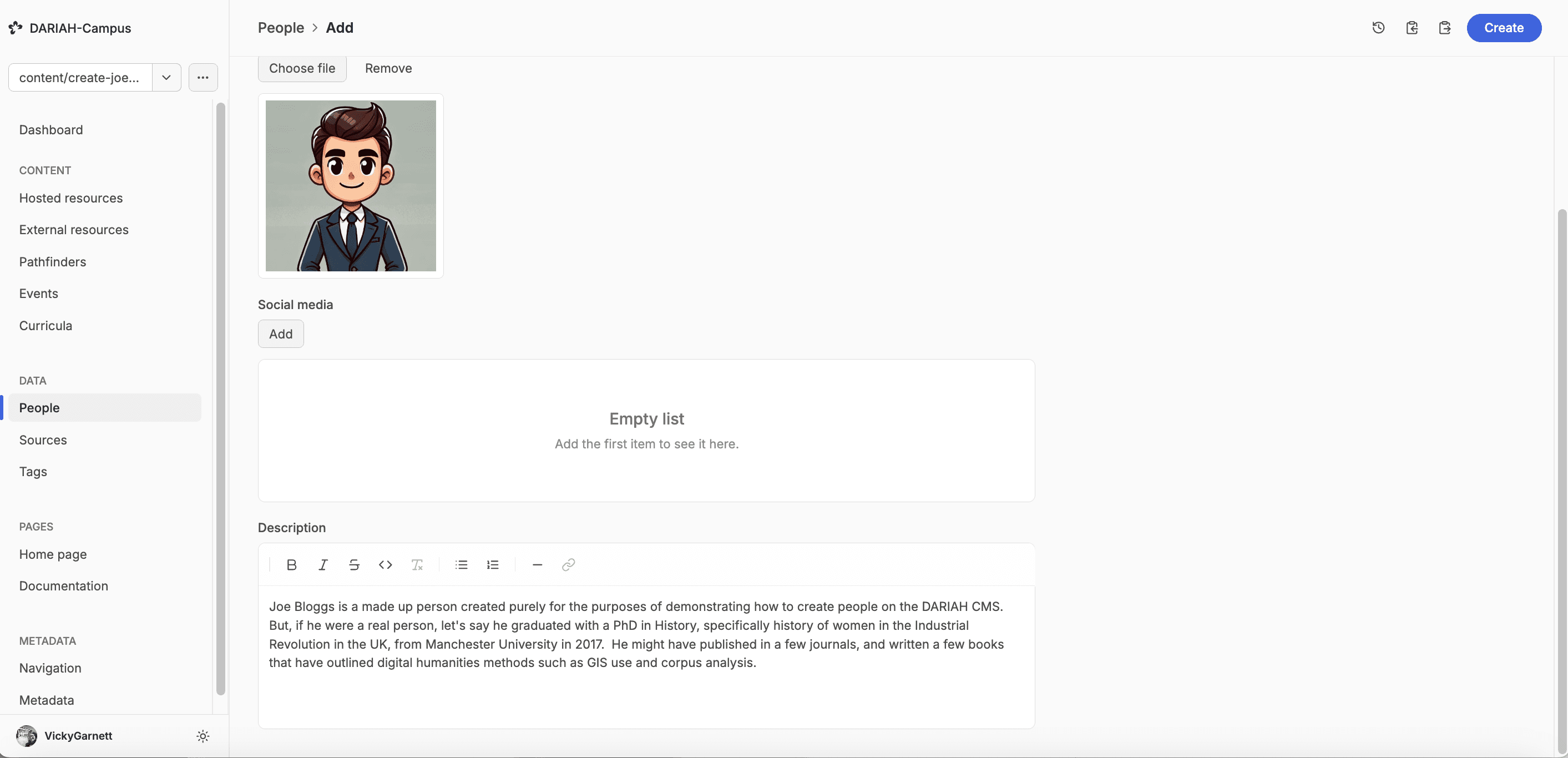 Before you begin creating any new ‘Person’ profile, you need to first check that they aren’t already in the system, in order to avoid duplications. You can do this in the CMS and also on the main DARIAH-Campus website. But, as we are discussing the CMS here, we will focus on that method.