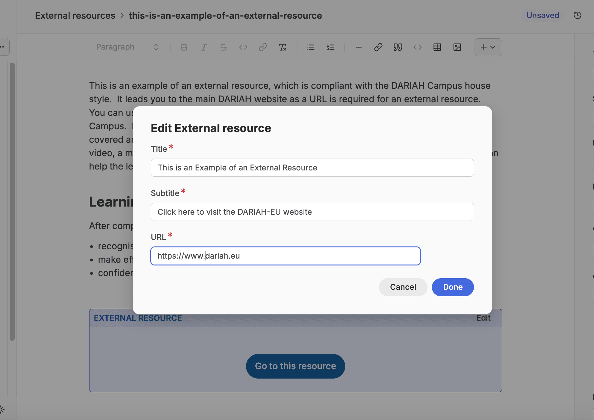 A placeholder box for an External Resource will appear in the workspace. Click on the ‘Edit’ button, and a pop-up window will appear asking you for additional required information. In the ‘Title’ field, you can enter the resource title. You can shorten this to the ‘Summary title’ you may have used in the metadata if the full title is really long.