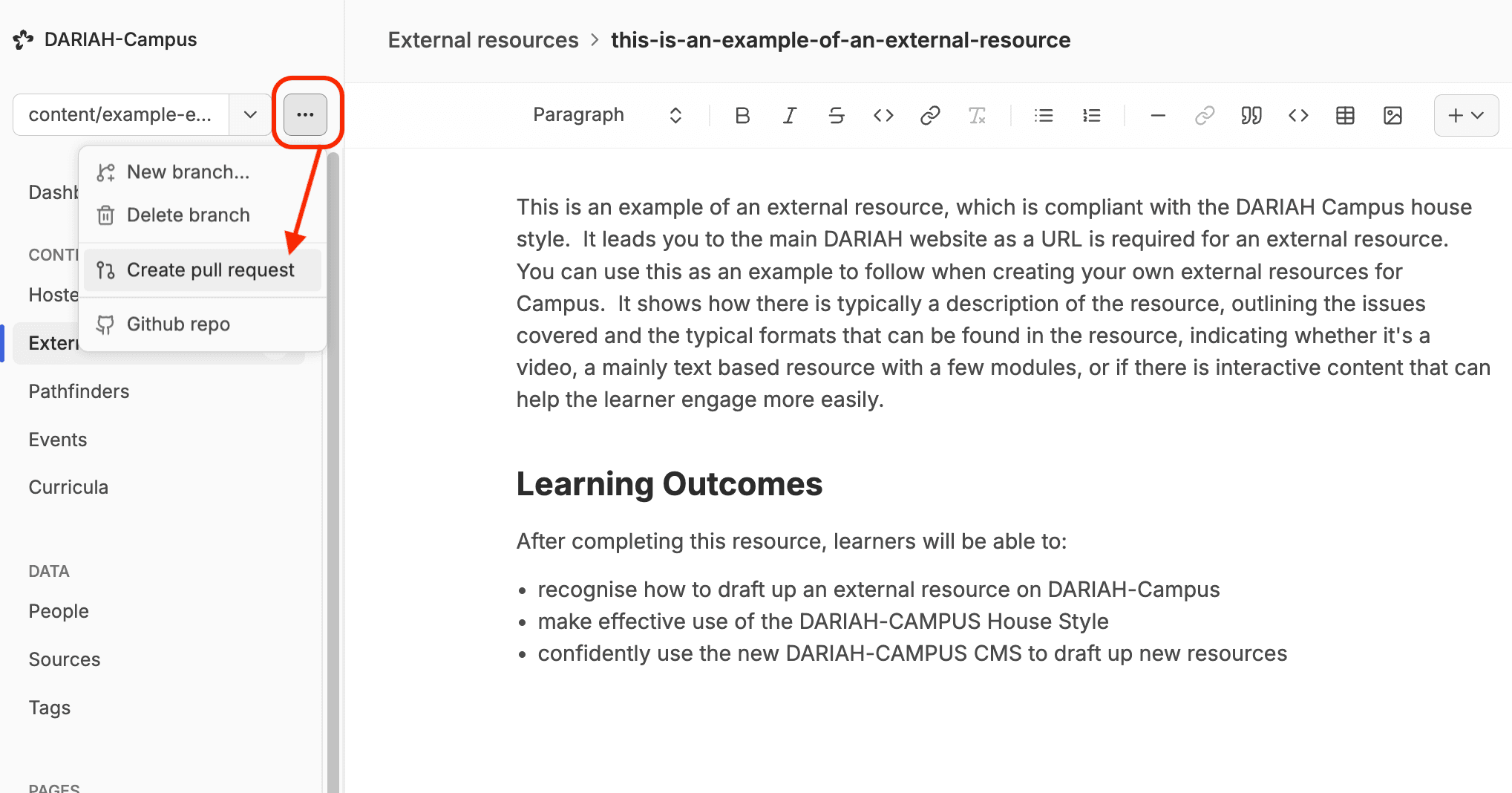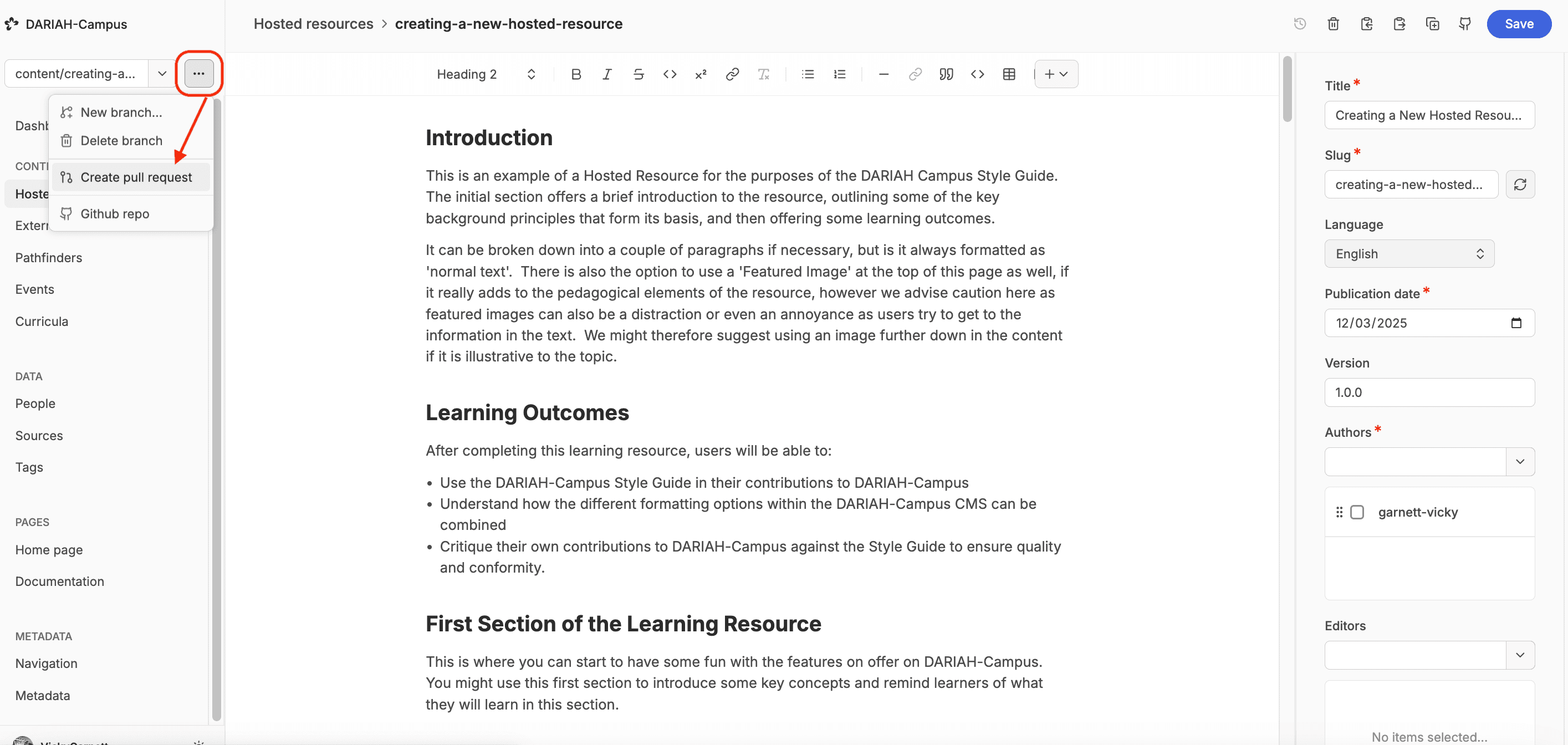 The content management system (version launched in March 2025) allows users to create new resources and make changes to people profiles using the same basic workflow as creating, pushing and pulling commits on GitHub, but through a more user-friendly interface that does not require any experience or knowledge of coding practices. No changes are published to DARIAH-Campus without the approval of the Editorial Board, and any changes you do make remain in a ‘branch’ that is separate from the main DARIAH-Campus website until it is ‘merged’ (published). This means that you can work on your resource without worrying too much about making any catastrophic changes that break the DARIAH-Campus website, as the editorial team won’t let it get that far!