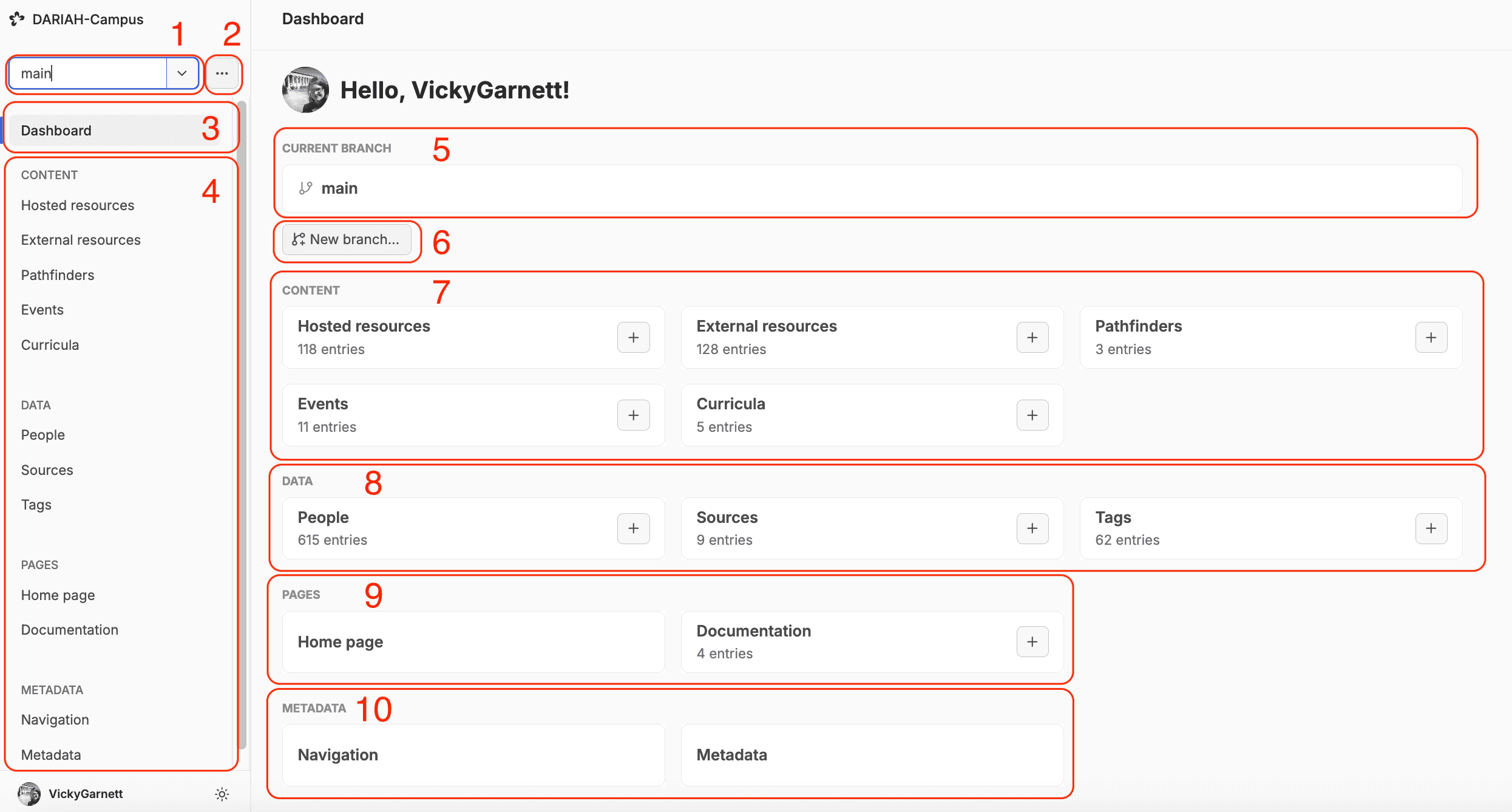At the top, (1) is a drop down menu which indicates the different branches. This is usually set to ‘main’. You use this drop down menu to move to different branches that contain different changes. Note that if you change branch while you are creating a new resource, that resource will no longer be available for edit and you may see an error message. The content has not been lost, it still lives in the branch in which it was created. To remove the error message, go back to the dashboard.