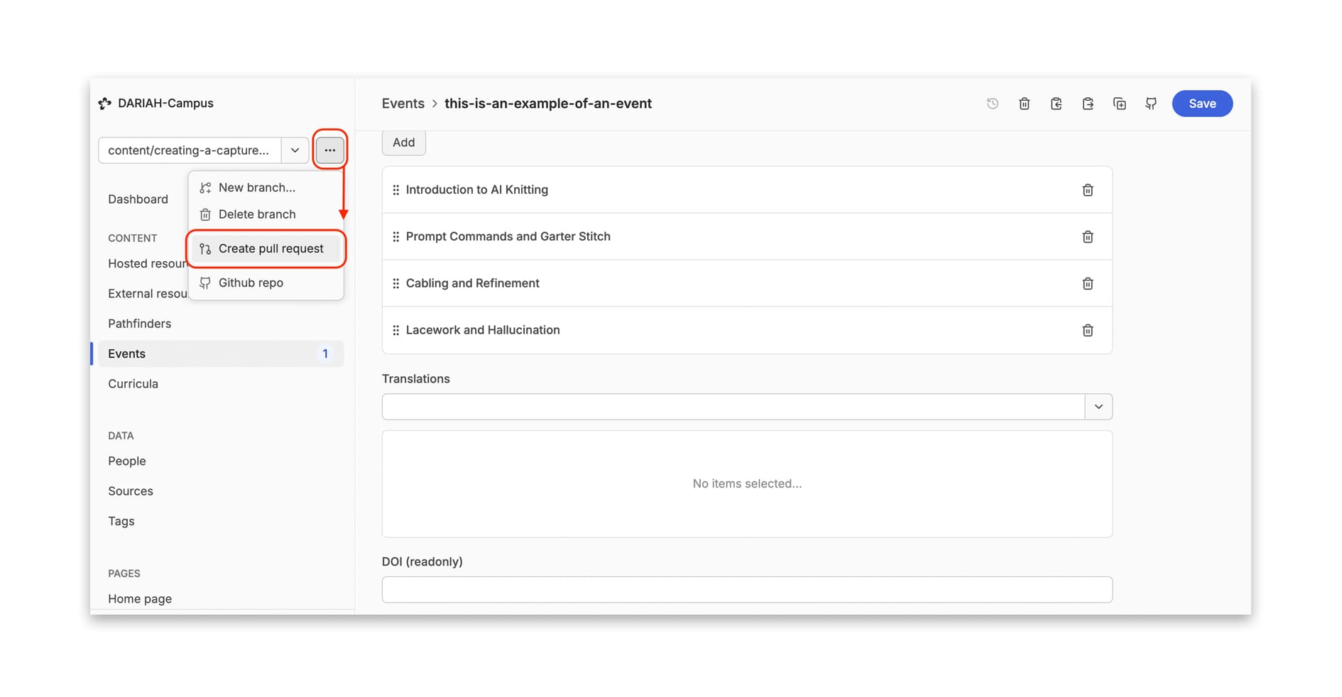 Once you are happy with your curriculum, you may wish to ‘create’ a pull request, and save your work. You can of course do this at any point in the editing process once the required event metadata has been entered. Exactly when you choose to create the pull request and save your work is up to you, depending on your own practices, although we recommend saving frequently after a set of changes.