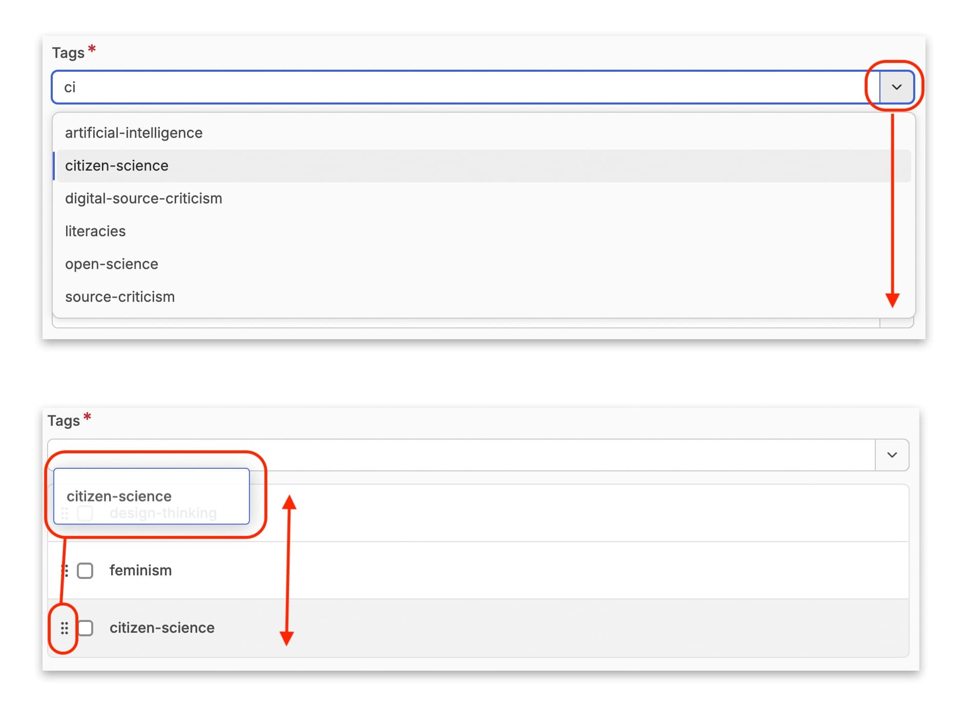 Tags are selected in the same way as authors. You can use the search field next to the drop down button to start typing a topic, and select an appropriate tag from or tags from there. You can also re-order these by clicking on the 6 dots and dragging the tag up or down the list.