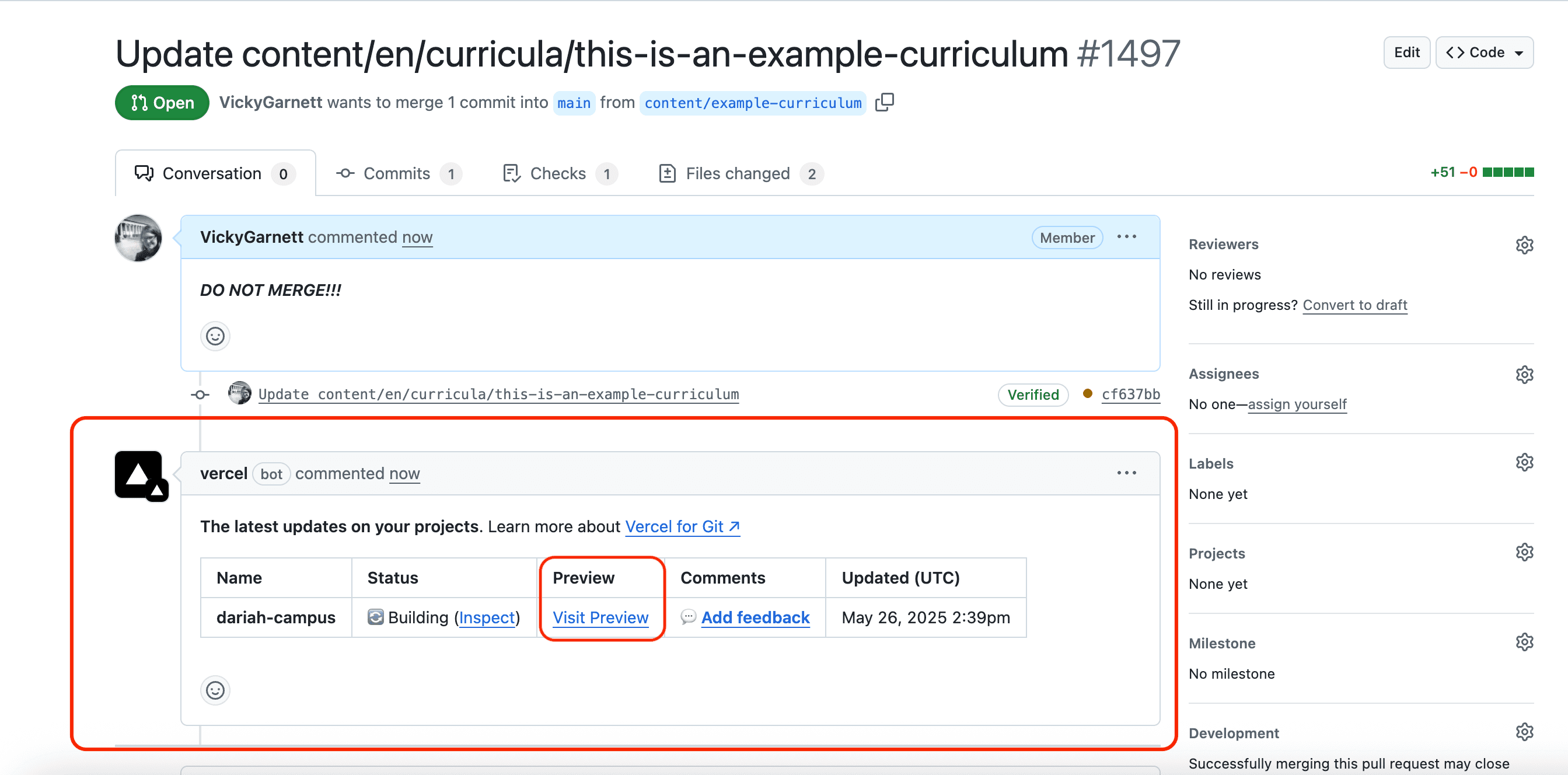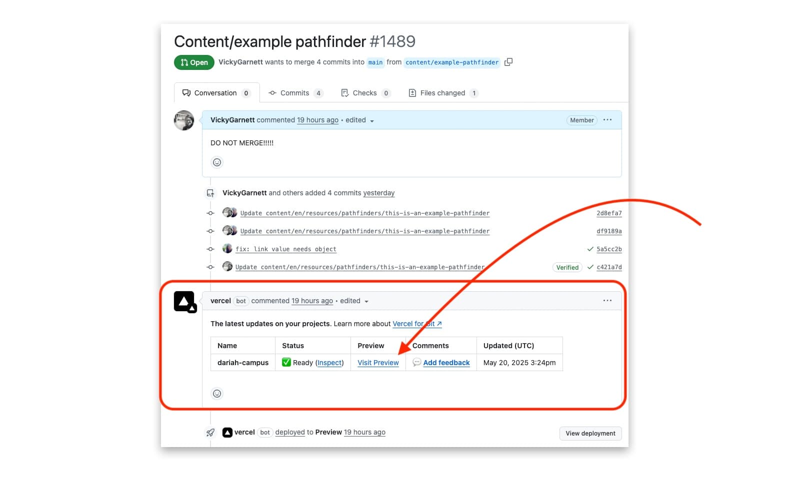 The screen will now change to show you the actual pull request that your draft is filed in on GitHub. After a short while, a ‘Vercel bot’ will post an automatic message to the Pull Request which includes a table showing a summary of the latest updates. In this table you will see a link to ‘Visit Preview’.