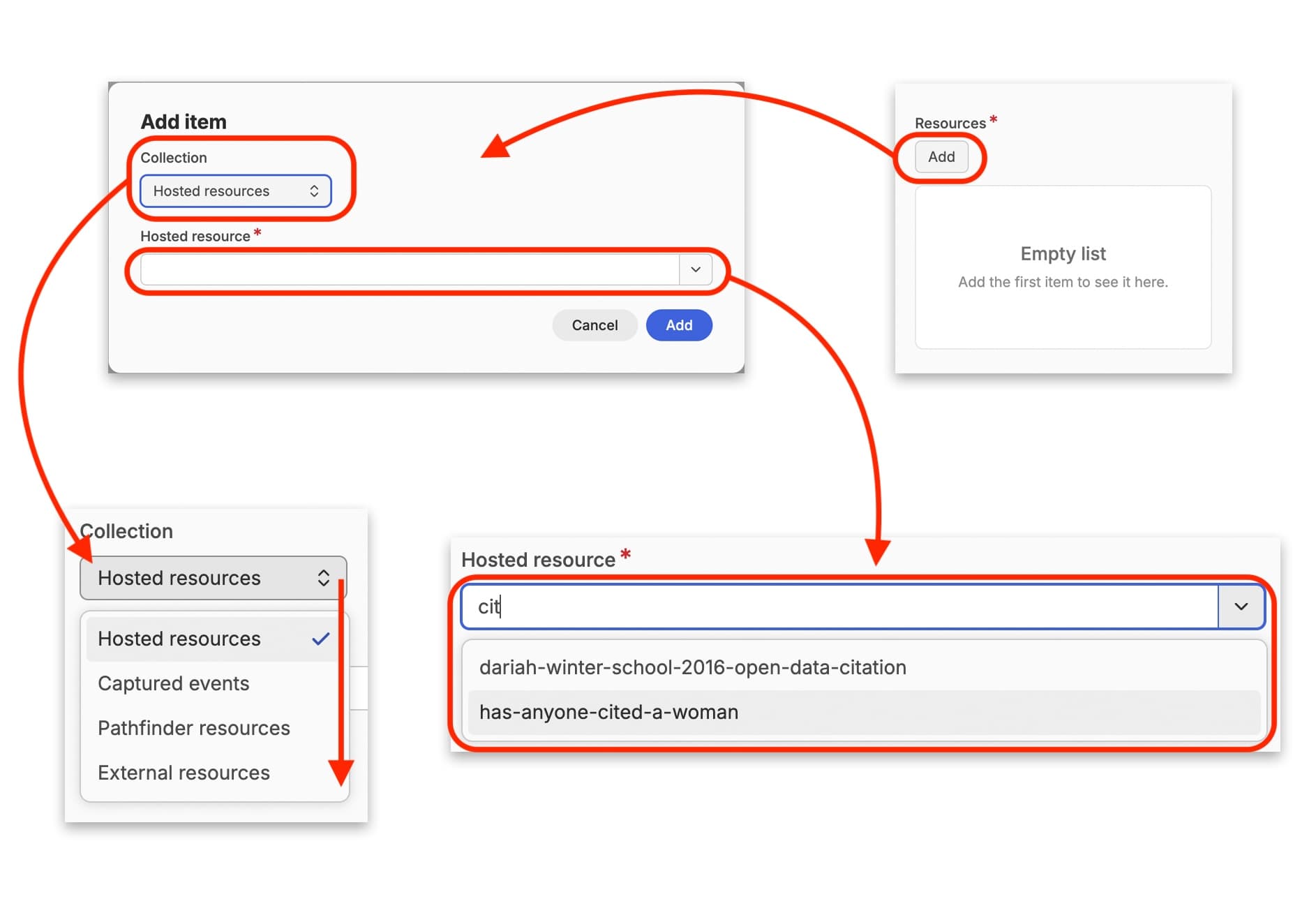 Click on the ‘Collections’ dropdown menu to select what type of resource you want to add. Then in the box below, you can start typing the name of the resource you want to add, and it will filter the results from the resource type you selected. Click on the resource you want, and it will be added to the list in the metadata. You can repeat this as many times as you need to, and you can also add different resource types.