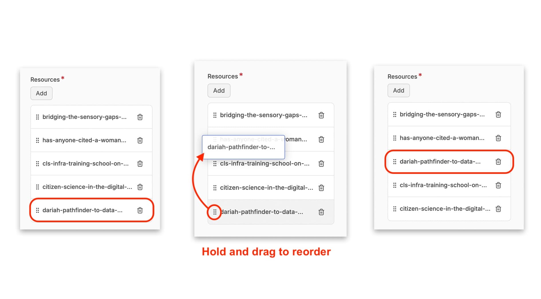 You can also re-order the resources you have added by clicking on the ‘move’ icon, holding and dragging them up to the position you want them to sit in.