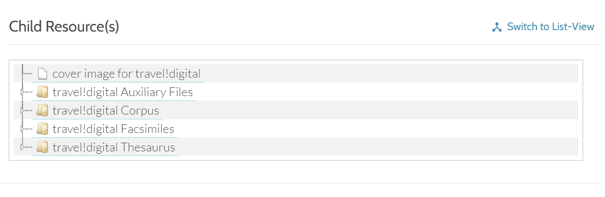 “Child Resources” der Sammlung “travel!digital” in ARCHE als Baumansicht.