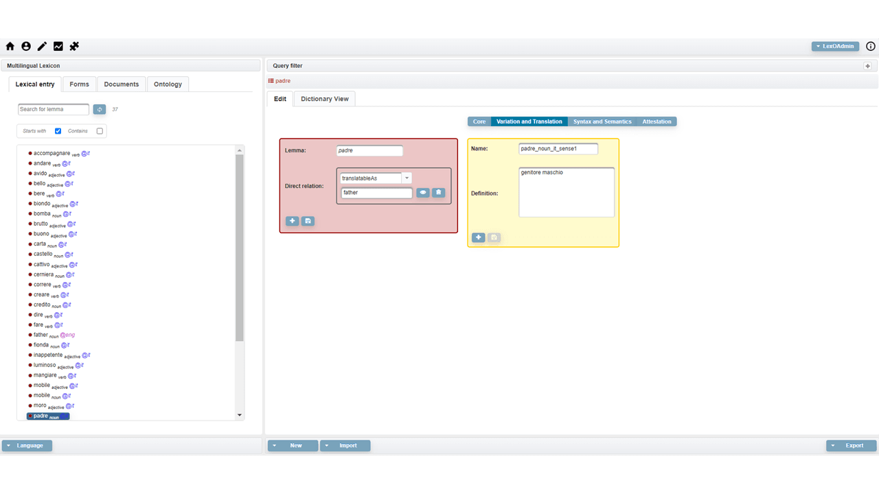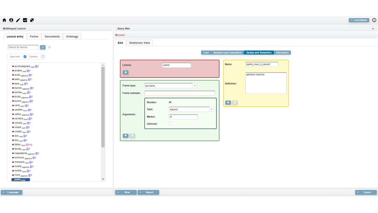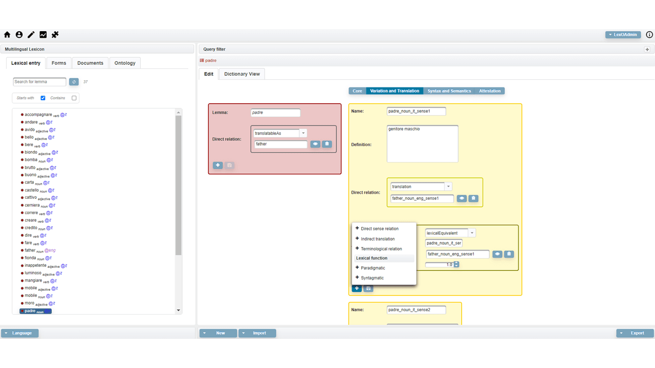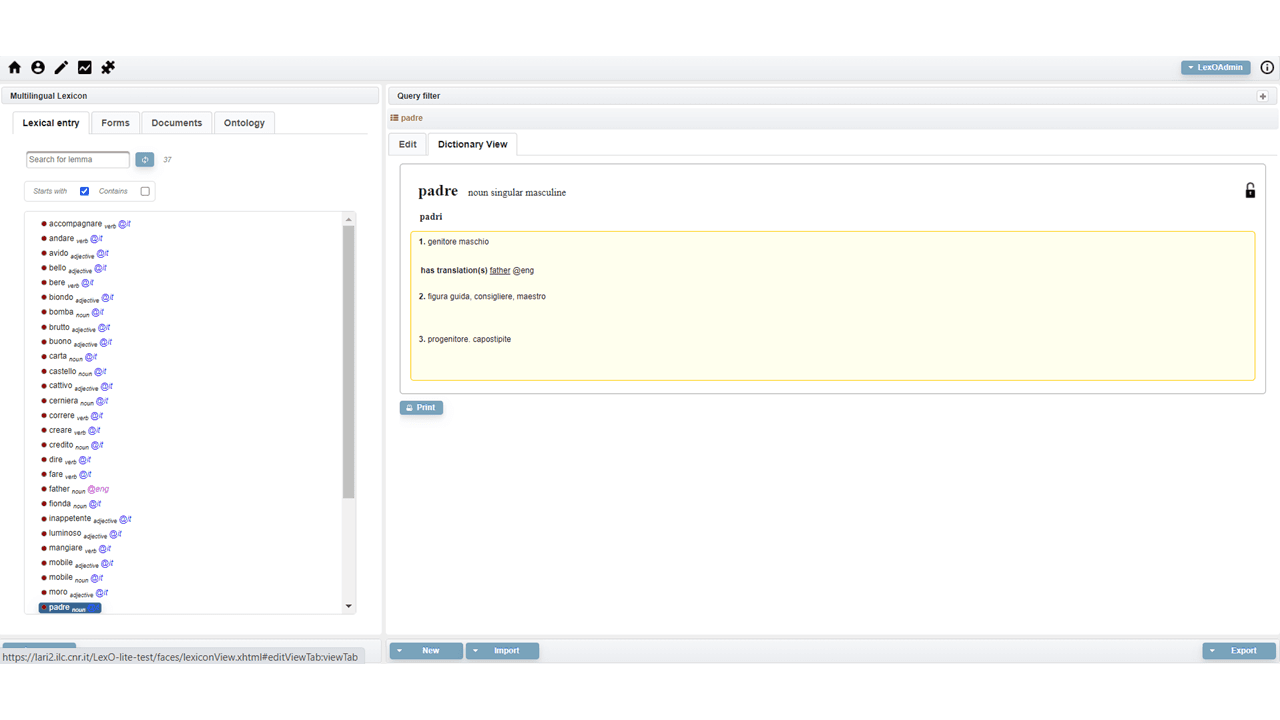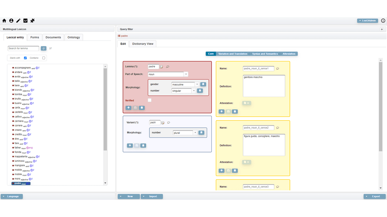 Since LexO allows users to create resources in a collaborative way, it defines three kinds of user profiles i.e., administrator (edit rights and users management), user (edit rights), viewer (browsing only). The system allows administrators to validate a lexical entry by means of the “verified” checkbox in the lemma box, in such a way that it can no longer be modified by users that are not administrators. This functionality makes it possible to implement a sort of revision process, for the final export of the resource in the OntoLex-Lemon model, which can be done by means of the Export button at the bottom of the toolbar. In this way, the resource is ready for publication according to the linked data policies.