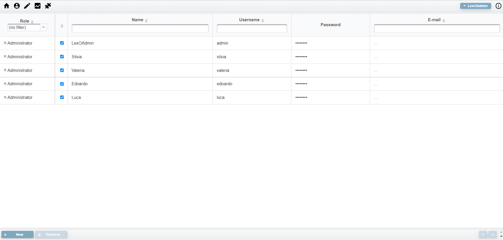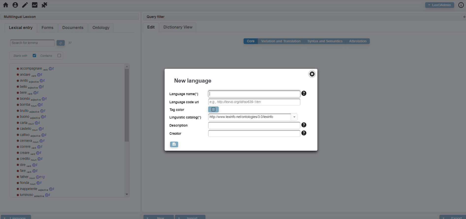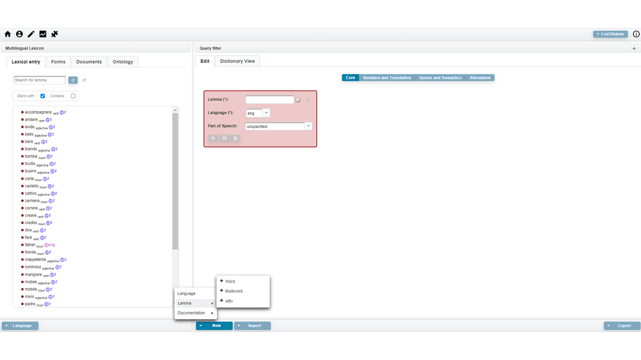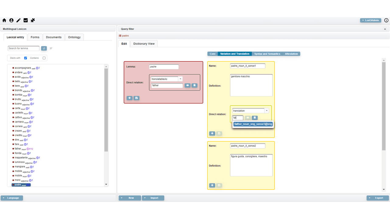 Since LexO allows users to create resources in a collaborative way, it defines three kinds of user profiles i.e., administrator (edit rights and users management), user (edit rights), viewer (browsing only). The system allows administrators to validate a lexical entry by means of the “verified” checkbox in the lemma box, in such a way that it can no longer be modified by users that are not administrators. This functionality makes it possible to implement a sort of revision process, for the final export of the resource in the OntoLex-Lemon model, which can be done by means of the Export button at the bottom of the toolbar. In this way, the resource is ready for publication according to the linked data policies.