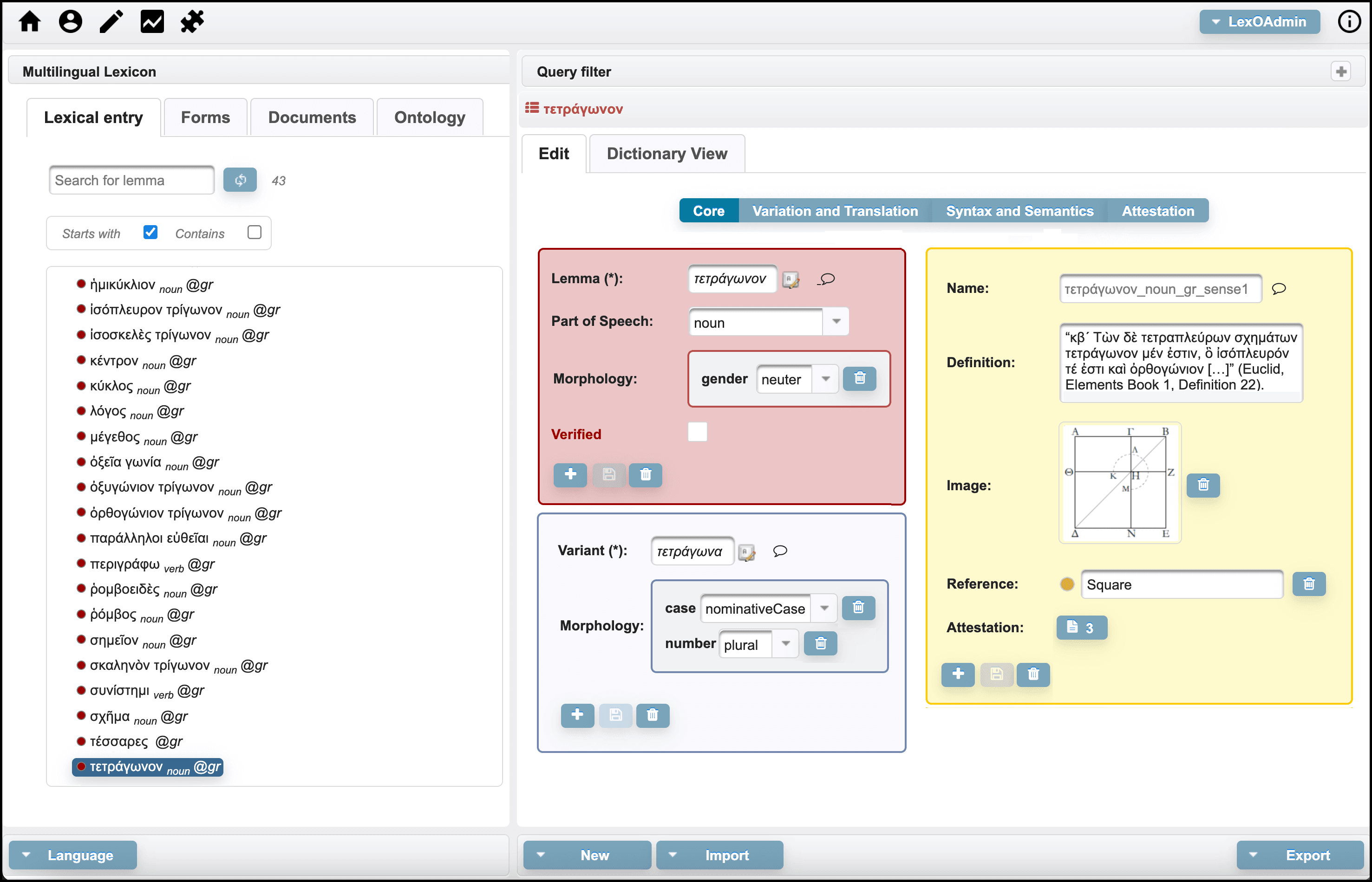 The figure above shows the information displayed when selecting the greek lexical entry τετράγωνον (‘square’ in English): in the red box the main information concerning the lemma, such as grammatical category, gender and number are illustrated; in the blue box you will find the description of the forms occurring in the reference text. The senses are described in the yellow boxes. As far as the Documentation tab is concerned, LexO shows the metadata panel of the selected text; the Ontology tab instead lists the concepts belonging to a reference ontology that would have been previously uploaded.