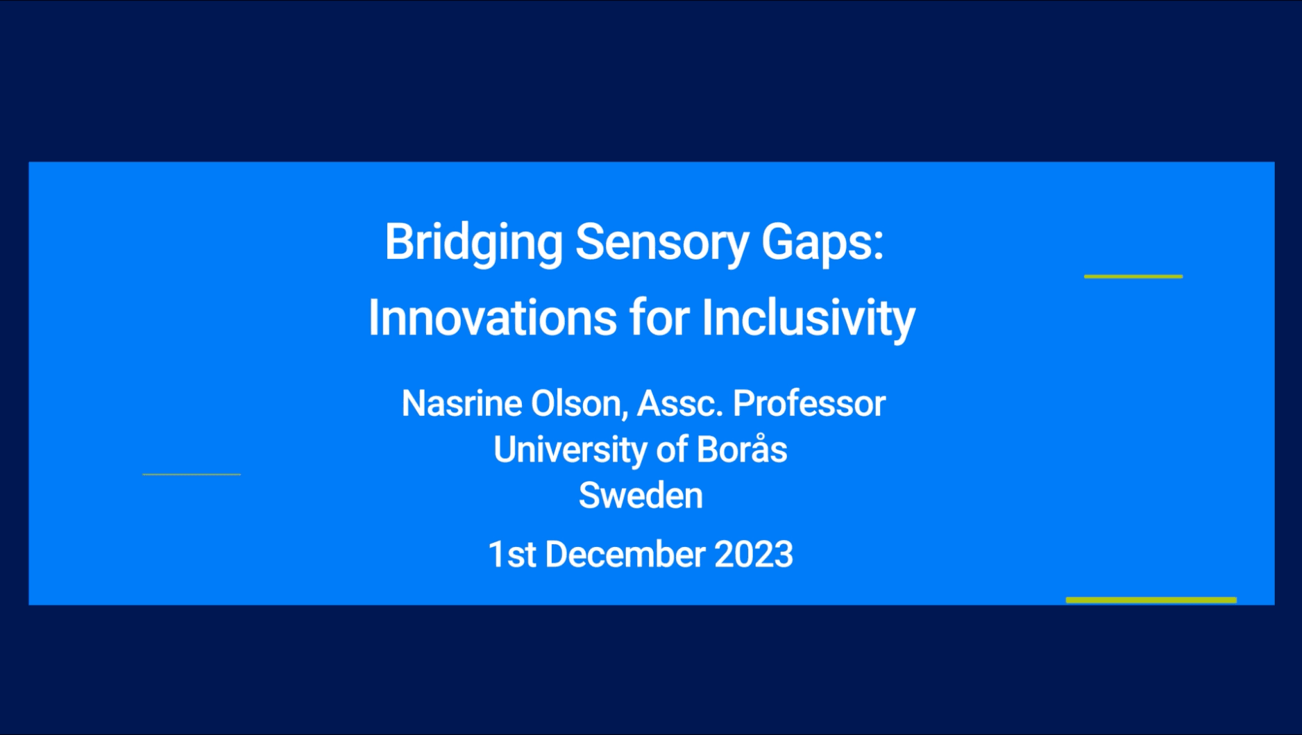 With around 15% of the global population experiencing some form of disability, have we truly considered what ‘inclusion’ and ‘equal opportunity’ means for all? This talk confronts the reality that most spaces, technologies, and innovations are predominantly designed for individuals with all senses and functionalities intact. How would you as a person with deafblindness navigate the world – a world filled with navigation and mobility challenges, inaccessible information, and technologies that rely on the senses of sight and hearing? In this talk, Nasrine Olson (PhD, Associate Professor) introduces the idea behind the formation of the Centre for Inclusive Studies at University of Borås and presents a few projects that have explored ways in which technology can be leveraged to level the playing field.