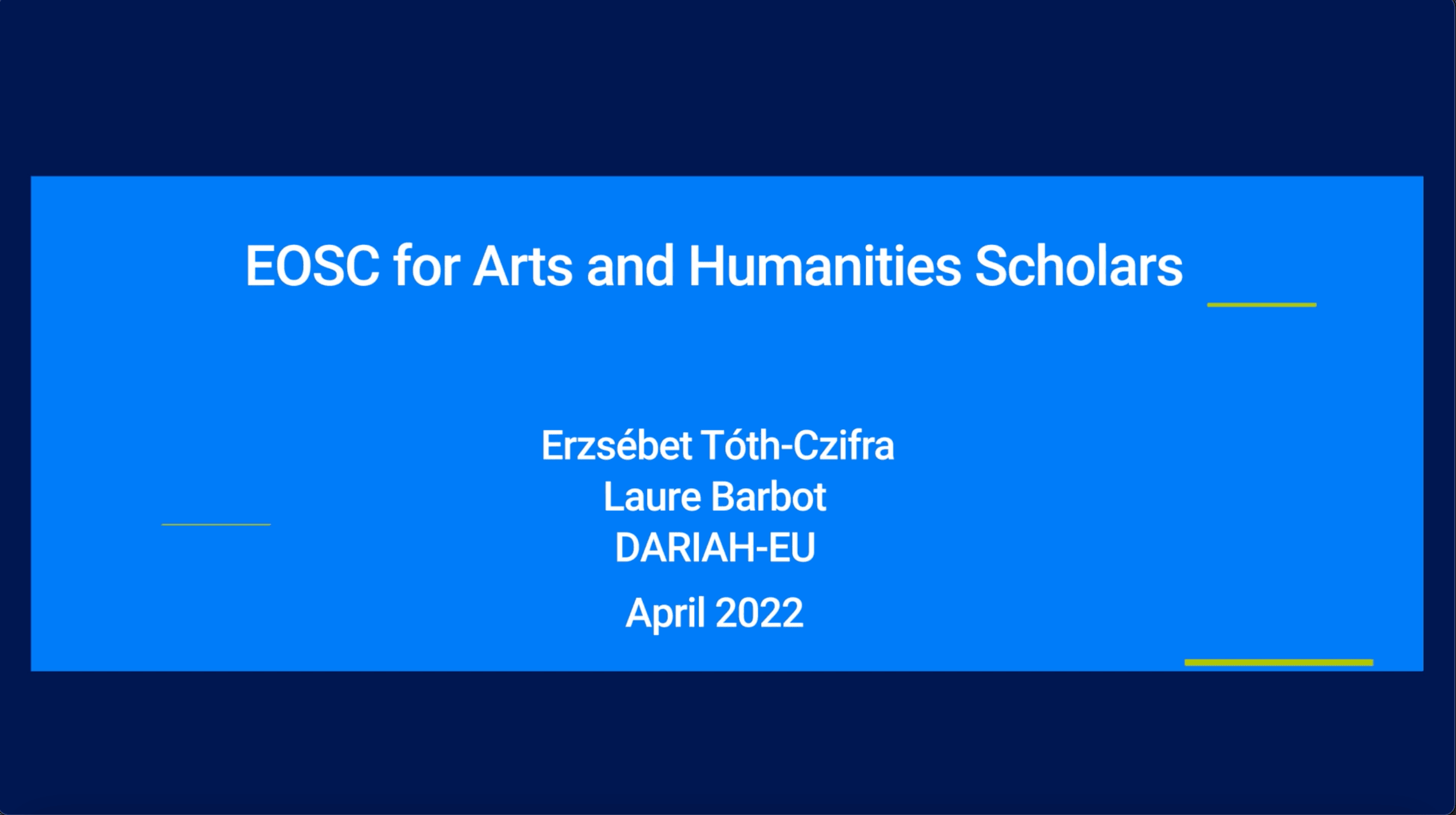 Erzsébet Tóth-Czifra and Laure Barbot provide an introduction to EOSC and open science projects for researchers and practitioners working in the Arts and Humanities. They include a brief walk through the EOSC landscape, and how different EOSC projects are working towards ensuring open science for all.