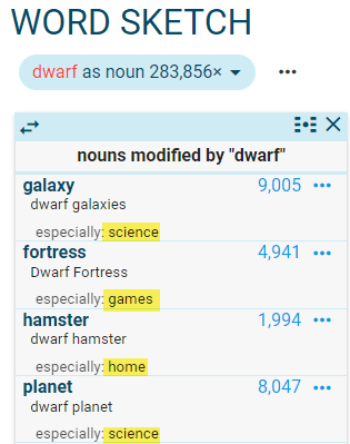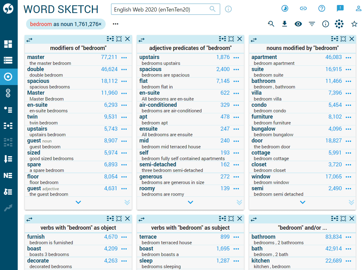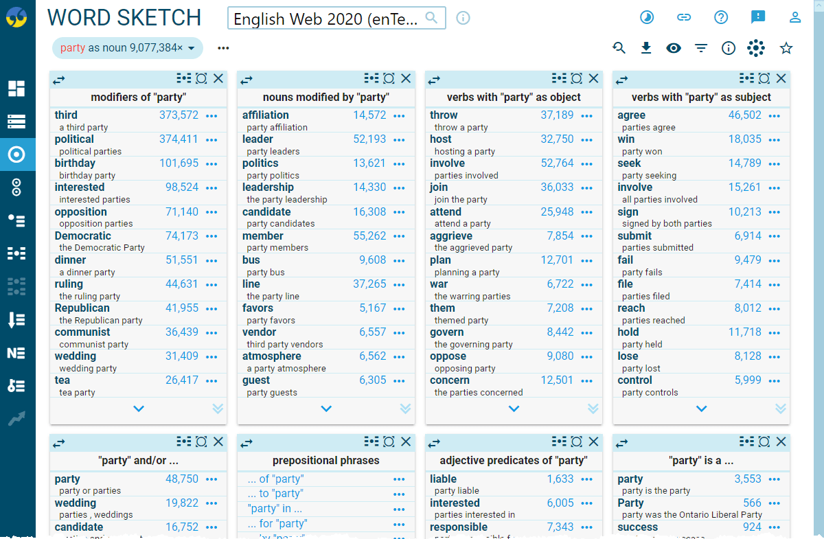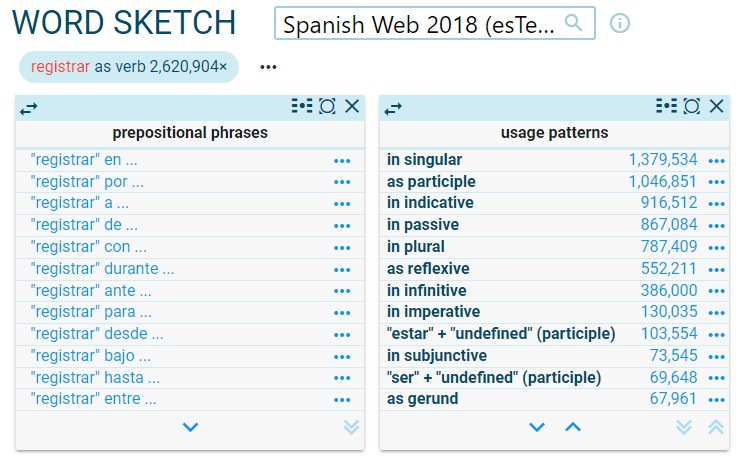 Word sketches contain some grammatical relations specifically designed to identify the typical patterns, such as prepositions before and after the word or usage patterns: