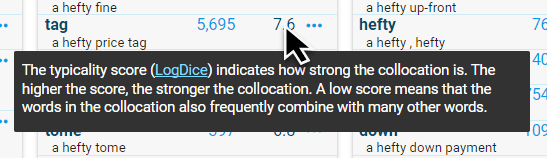 Different tools which are part of a corpus software offer various types of statistics. It is beyond the scope of this course to provide a detailed explanation of each of them. However, when using Sketch Engine, the interface provides quick reference as well as detailed information about the various types of statistics via tooltips that are displayed upon hovering the mouse over the statistic or over the column header. The tooltips frequently contain links to more detailed information.