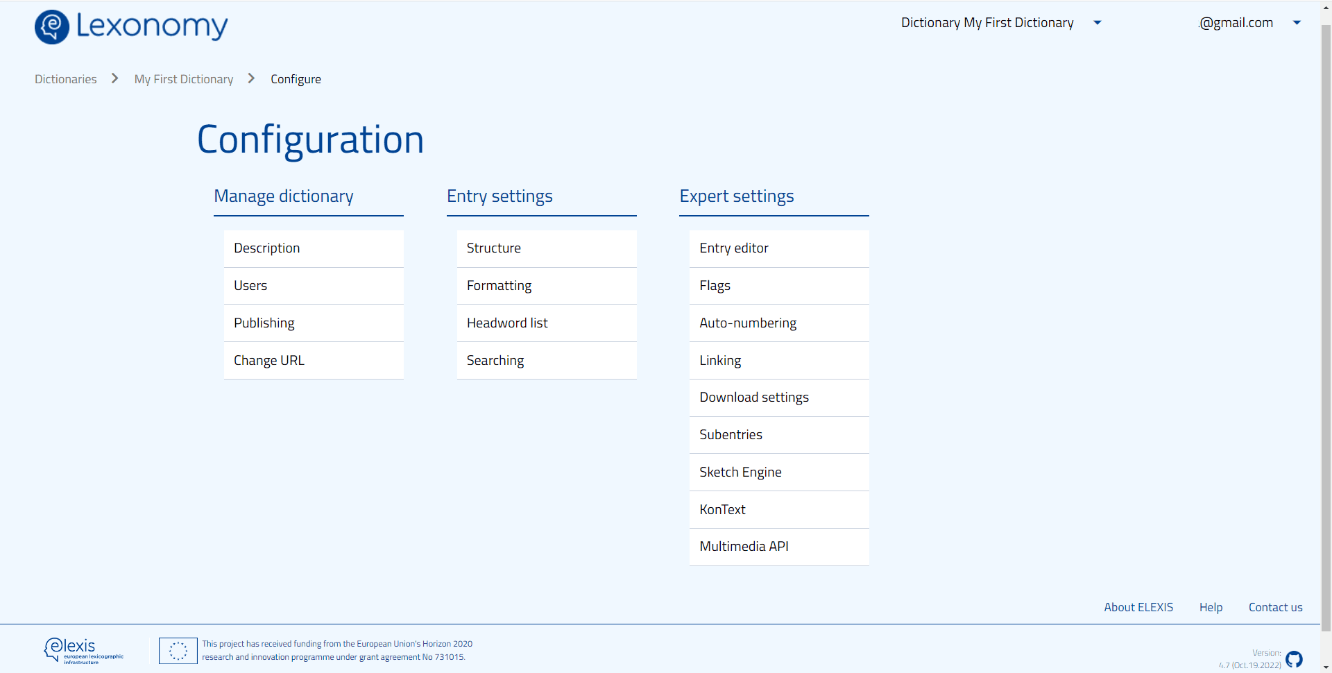 Click the Configure link in the top menu bar and Lexonomy will take you to its configuration menu. This is where you can set up various things that affect the entire dictionary. There are four main groups of actions: