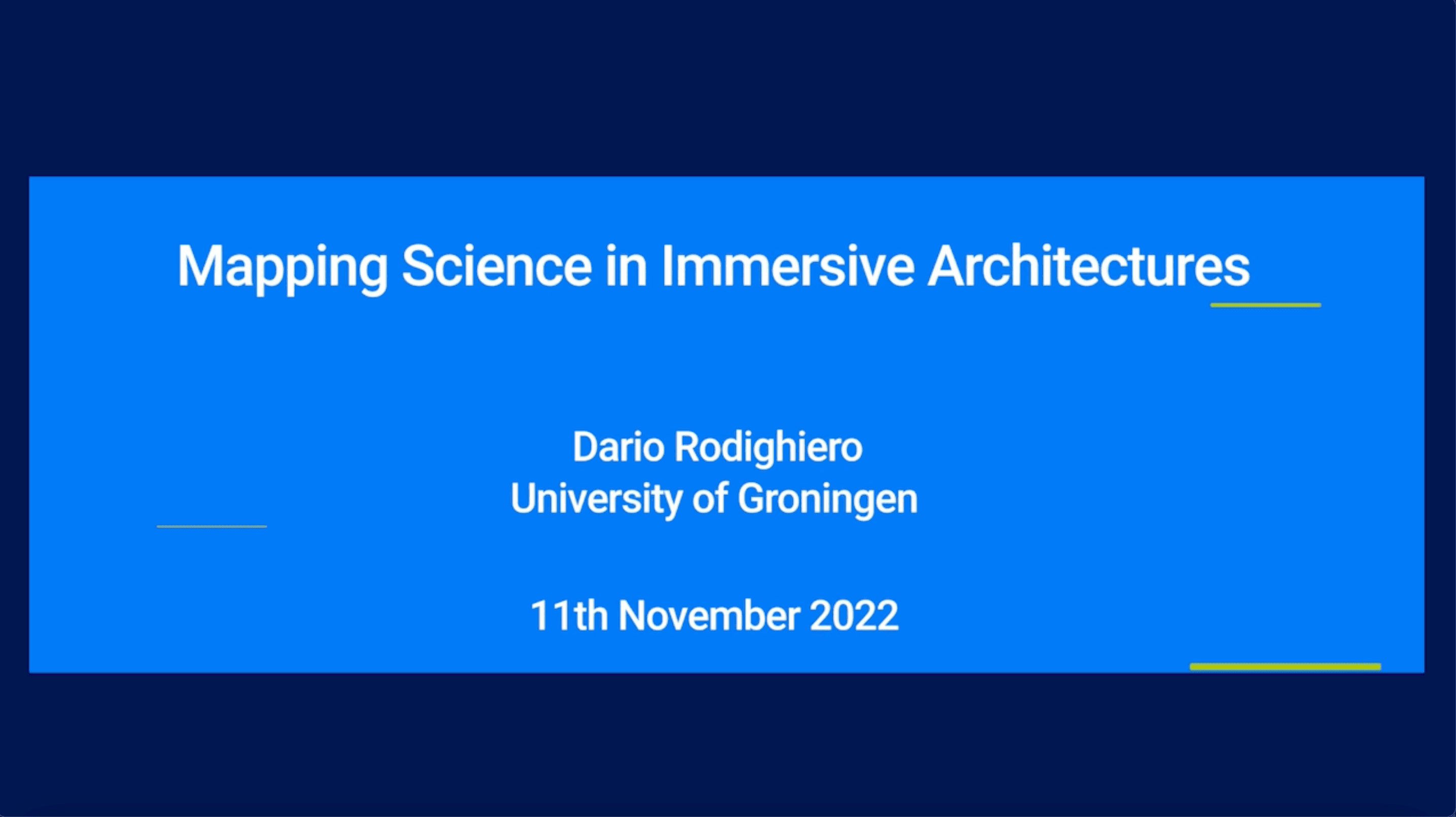 Although the mapping of science is broadly interested in representing scholarly knowledge, its use is often related to bibliometric techniques such as citation analysis. This presentation brings back the science mapping to its original meaning by widening its context to arts and humanities with the help of design. By refocusing the final user to scientists themselves and the general public looking at science, the audience is conducted through a series of data visualisations that present scholarly knowledge through immersive architectures in digital and public spaces. In a study related to experimental museology, the idea is to take out science from the laboratory and make its structure and dynamics visible again for all of us.