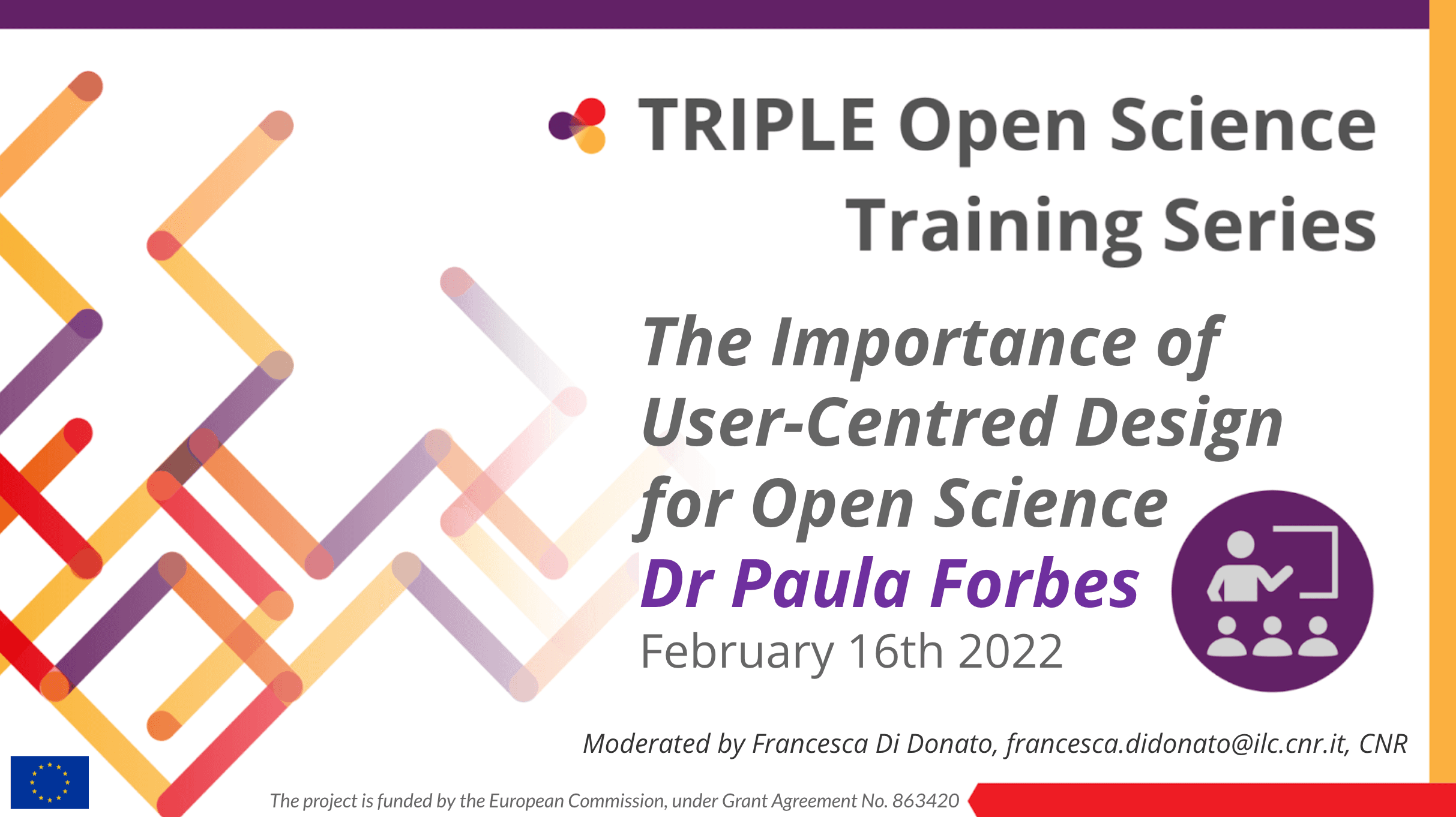 The training session is dedicated to User-Centred Design for Open Science and is presented by Paula Forbes, a cross-disciplinary researcher on User research who works across Social Science, Computing Science & Life Science and is based at Abertay University.