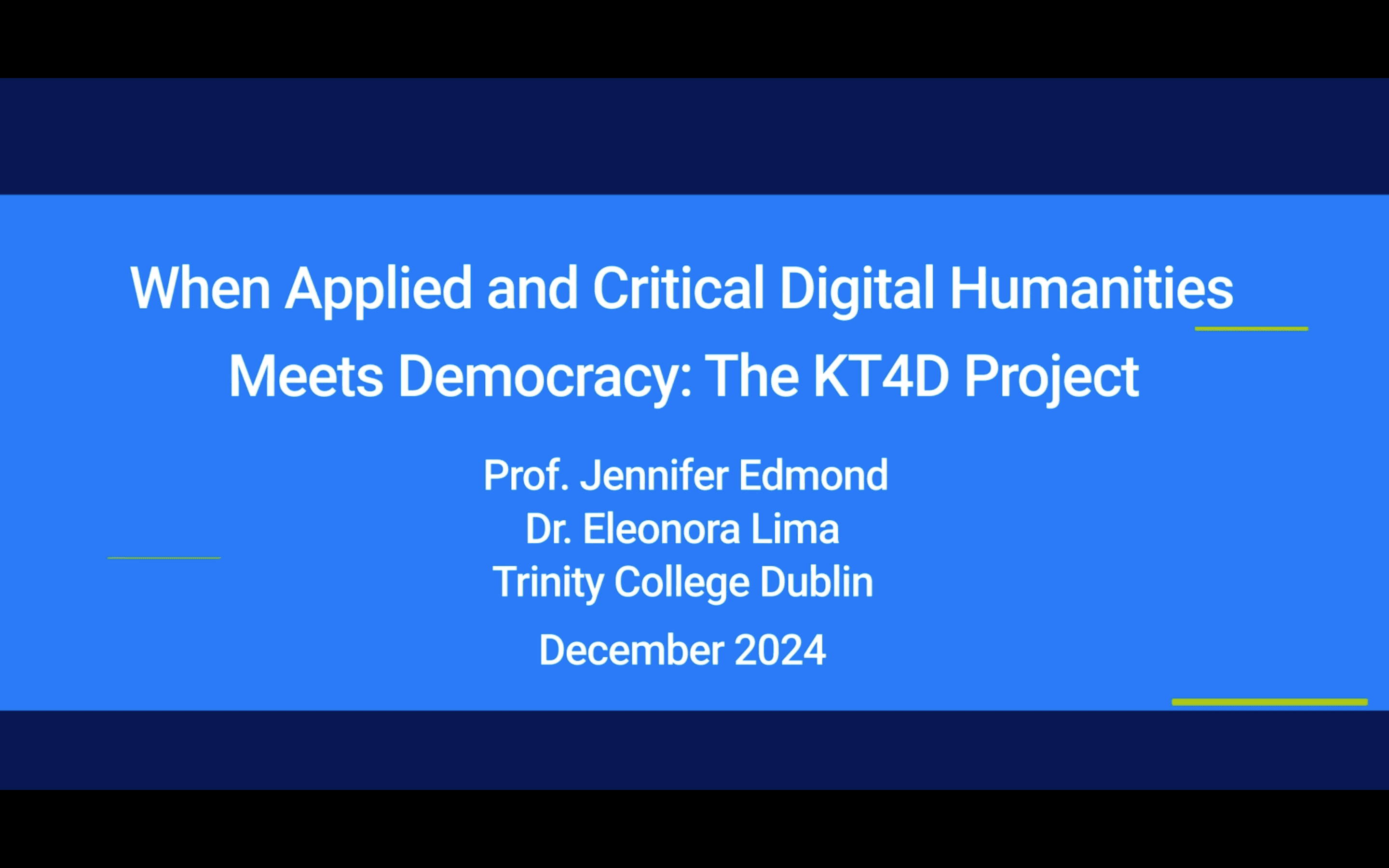 Throughout its activities, KT4D brings precisely this balance of technological acumen and humanistic criticality to its approach to facilitating more productive interactions between AI, big data and democracy. In particular this presentation will focus on how the project integrates humanistic knowledge, values, and modes of interaction to expand our notion of digital humanities work, and of the future of civic participation in a technologised world.